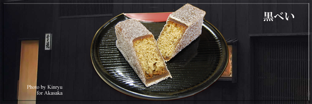 | 胡桃(くるみ)入りの黒糖カステラを羊羹で包み、グラニー糖をまぶした、風味の良い菓子です。今日では、もうほとんどみかけなくなってしまった東京・赤坂料亭街の【黒塀】をモチーフにデザインをしたパッケージは、黒を基調としたシックで重厚なデザインに仕上げられています。懐かしい情景を偲んでお菓子の姿に現した和菓子なので【黒べい】と名付けられました。 |